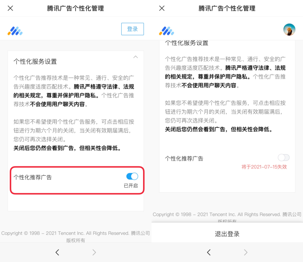 關閉之后后你依然會在朋友圈看到廣告,只不過廣告與你的相關性會降低,且關閉個性化推薦是存在有效期的,為 6 個月,失效之后會再次自動開啟個性化推薦。