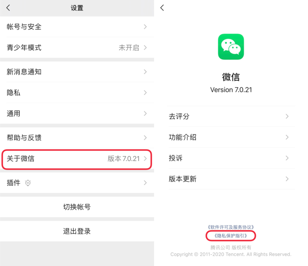 打開微信設置頁面,選擇「關于微信」,在打開的頁面中,點擊下方的藍色小字《隱私保護指引》。