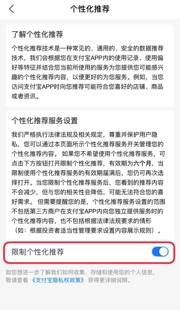 在打開的「個性化推薦」頁面中,可以看到支付寶對個性化推薦的說明,重要的是選擇開啟底部的「限制個性化推薦」,與微信一樣,它的有效期為六個月。
