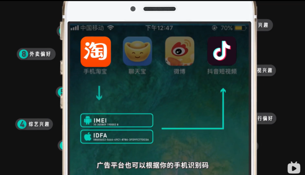 蘋果和安卓設備的手機識別碼存在著差別,蘋果主要的識別碼為IDFA,也叫廣告標識符,安卓的識別碼稱為IMEI,也即我們常說的手機序列號。