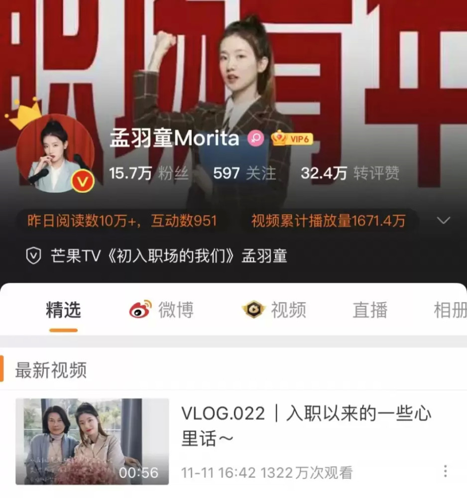 孟羽童的微博粉絲來到了15萬。在置頂視頻中,她向大家報告已經正式入職格力兩個月,并希望大家“可以多多支持我們格力電器”。這條內容獲得了10萬+點贊。孟羽童的小紅書粉絲數達到38萬。在筆記中的“好物口袋”子菜單,她已化身事業有成的時尚博主“口播帶貨”,將穿搭、美妝、護膚、家居品牌逐一安利。